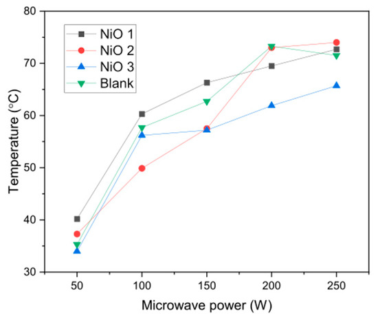To confirm this hypothesis, the temperature of water after a 30 s pulse of microwave irradiation at different powers is shown in Figure 5. The temperature reached around 75 °C at 200–250 W, although it is thought that selective heating of the NiO nanoparticles means that the active sites on the surface would be much higher than the bulk water temperature.