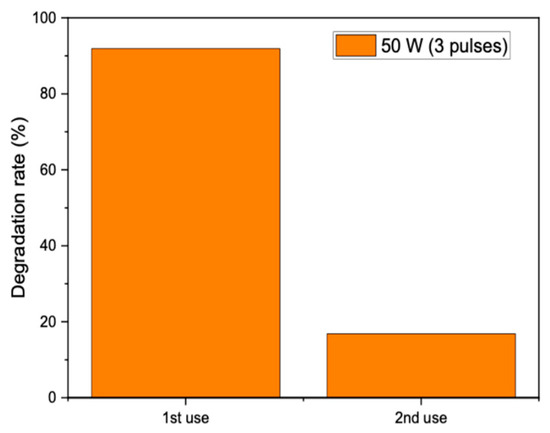 Reuse data for NiO 2 catalyst for methyl orange degradation. Microwave conditions: 3 pulses; 10 s cycle; reaction conditions: initial MO concentration = 49.76 μmol/L; MO volume = 3 mL; catalyst mass = 5 mg.