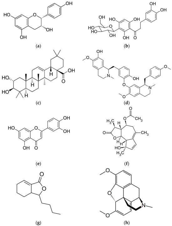 The compounds studied in the paper: (a) afzelechin; (b) aspalathin; (c) D-maslinic acid; (d) isoliensinine; (e) luteolin; (f) matricin; (g) sedanolide; (h) thebaine.