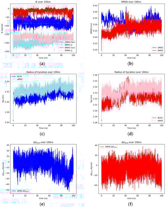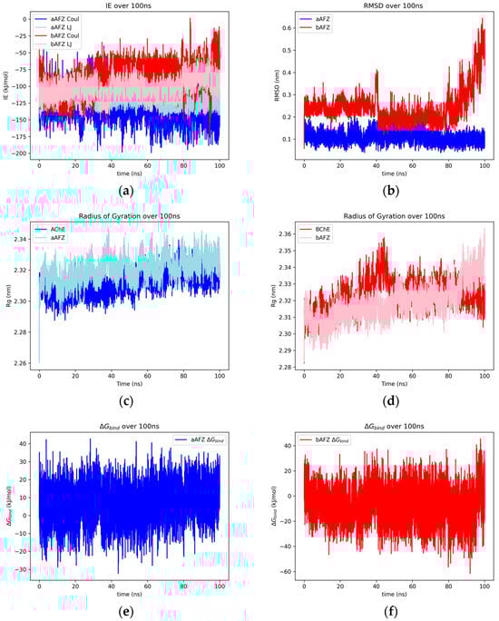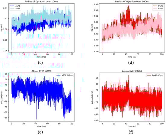 The SR-LJ and SR-Coul interaction energies of the AChE–aspalathin and BChE–aspalathin complexes over 100 ns (a), the RMSD of heavy atoms of aspalathin docked with AChE and BChE over 100 ns (b), and the radius of gyration over 100 ns of the protein for uninhibited AChE/BChE and AChE/BChE–aspalathin complexes (c,d). Plots for the Gibbs free energy estimate between AChE–aspalathin (e) and BChE–aspalathin (f).