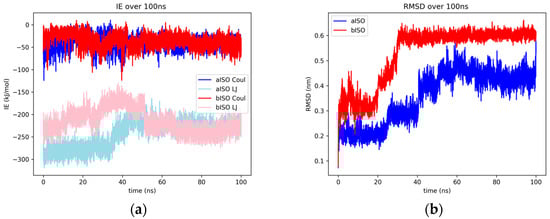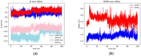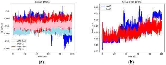 Concerning interaction energies, Lennard-Jones interactions were found to be the largest contributors for both AChE and BChE complexes. With that said, in all three simulations, the Coulombic contribution would occasionally peak below the Lennard-Jones contribution for the AChE–ligand cases (Figure 3a, Figures S5b and S9b). The aspalathin–AChE was found to have more significant interactions than BChE, with a difference in energy value of about 40 kJ/mol for Lennard-Jones interactions and a 25 kJ/mol difference for Coulombic interactions. A much tighter grouping between Lennard-Jones and Coulombic interaction energies was observed for both ChE–aspalathin complexes, more than most other enzyme–ligand complexes in this study.