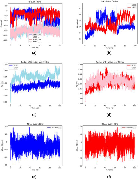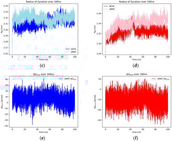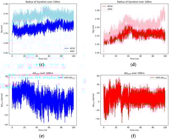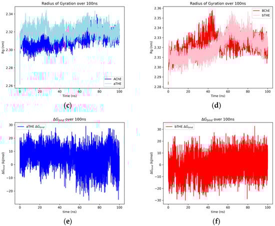 The SR-LJ and SR-Coul interaction energies of the AChE–thebaine and BChE–thebaine complexes over 100 ns (a), the RMSD of heavy atoms of thebaine docked with AChE and BChE over 100 ns (b), and the radius of gyration over 100 ns of the protein for uninhibited AChE/BChE and AChE/BChE–thebaine complexes (c,d). Plots for the Gibbs free energy estimate between AChE–thebaine (e) and BChE–thebaine (f).