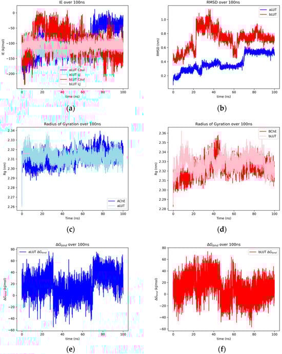 The SR-LJ and SR-Coul interaction energies of the AChE–luteolin and BChE–luteolin complexes over 100 ns (a), the RMSD of heavy atoms of luteolin docked with AChE and BChE over 100 ns (b), and the radius of gyration over 100 ns of the protein for uninhibited AChE/BChE and AChE/BChE–luteolin complexes (c,d). Plots for the Gibbs free energy estimate between AChE–luteolin (e) and BChE–luteolin (f).