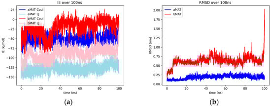 Interaction energies too differed between ChEs. While the AChE complex held interaction energies relatively constant through the whole production runs, the BChE complex’s interacting energies oscillated through the 100 ns (Figure 7a, Figures S5f and S9f). In the BChE complex pictured below, increases/decreases in Coulombic potential perfectly aligned with increases/decreases in the values for the Lennard-Jones energy, a trend unlike any other tested compounds. An explanation may lie in the tight grouping of functional groups that would induce both electrostatic and Van der Waals interactions present in matricin’s structure.