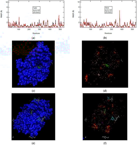 (a) RMSF plots for 1W6R in pure (black) and original (red) states; (b) RMSF plots for 4BDS in pure (black) and original (red) states; (c) surf representation for 1W6R: pink balls are water molecules, and the ligand Glanthamine is in the gorge and colored green; (d) the residues (red) in 1W6R that show large RMSF values; (e) surf representation for 4BDS: pink balls are water molecules, and the ligand Tacrine is in the gorge and colored green; (f) the residues (red) in 4BDS that show large RMSF values.
