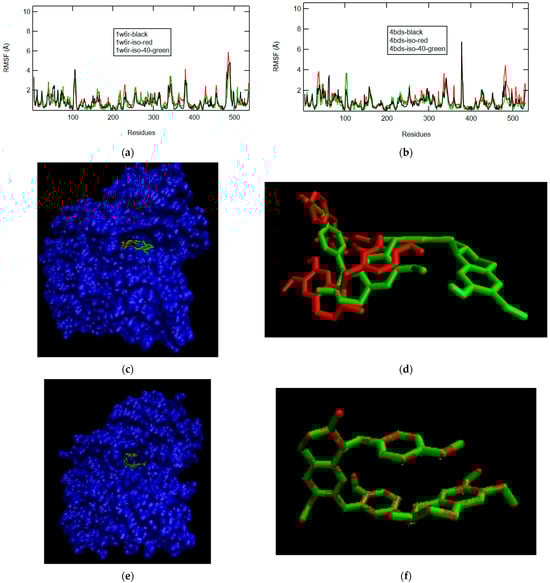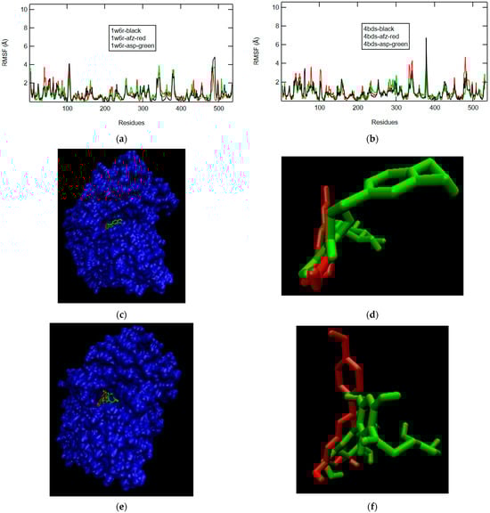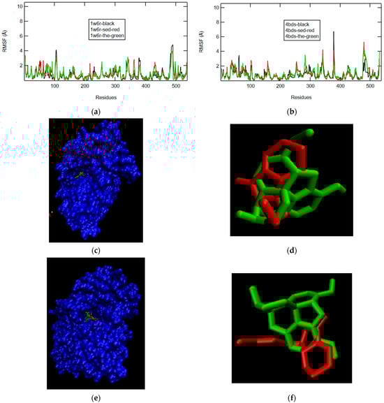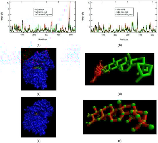 The RMSF plots of the ligands afzelechin and aspalathin resemble the RMSF plot of the enzyme very well, but the confirmations of afzelechin and aspalathin show significant differences. Aspalathin extends its glucose ring out of the gorge in both 1W6R and 4BDS (Figure 11c–f). It is also clear that afzelechin has more space to maneuver in 4BDS than in 1W6R (Figure 11c,e).