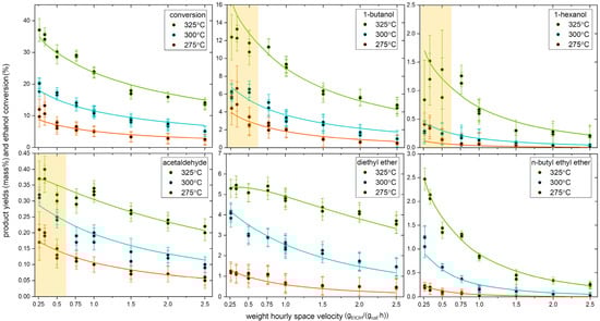Measurements were conducted until the product distribution became stationary. Then, under steady-state conditions, parallel measurements were taken every hour. A total of 59 measurements were taken in regard to 23 conditions (3 temperatures and 7–8 WHSVs), resulting in 434 product yield data points, including 59 for ethanol. The ethanol conversion and product yields (in mass%) for five species are shown in Figure 2 (vide infra) and, in Figure S4, for three additional minor products (crotonaldehyde, crotyl alcohol, and butyraldehyde), as well as in tabulated form in Table S2. The yields show monotonic trends in regard to the WHSV and temperature for all species, except for 1-butanol and 1-hexanol at high temperatures and low WHSV values, where the data exhibit low reproducibility (i.e., large error bars) and non-monotonic, noise-like variations in regard to the WHSV, suggesting the presence of potential experimental issues.