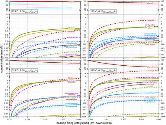 Ethanol is continuously consumed along the reactor, with the reaction rate gradually decreasing downstream. Additionally, the concentrations of all the product species increase monotonically along the reactor, with a similar slowdown occurring by the fourth quarter of the catalyst bed. This slowdown is more pronounced at higher temperatures and lower WHSVs, wherein accelerated processes and longer contact times enable the system to approach equilibrium. The profiles of organic species at the lowest temperature (275 °C) and highest WHSV (2.50 gEtOH/(gcat·h)) are clustered into C2 species (C2H4, EtOH), C4 species (nBuOH, Et2O, CrA, CA, BA, B1E), and C6 species (HexOH, nBuOEt), which shows that the product distribution is largely kinetically controlled, as the later generation of products is produced with delays.