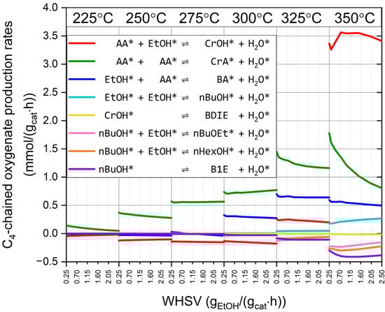 As our model showed excellent fit to the experimental data measured in the 275–325 °C temperature range, it can be used for extrapolation to lower temperatures, where the chemistry gets even simpler, and also to slightly higher temperatures, for e.g., +25 °C, wherein more side reactions occur. Figure 4 shows how the production rates and consumption rates of C4 alcohols and aldehydes via the discussed 4 + 4 channels vary in regard to the extended, 225–350 °C temperature range, as a function of the WHSV. The aldol condensation pathway is dominant in the range of 225–325 °C. The reverse reaction of the semi-direct coupling to form crotyl alcohol (R22rev: CrOH* + H2O* ⇌ AA* + EtOH*) is the main decomposition channel at temperatures of 225–300 °C. At 300 °C, the semi-direct coupling to form butyraldehyde also becomes important, alongside aldol condensation. At 325 °C, the semi-direct coupling to form crotyl alcohol starts contributing to C4 alcohol/aldehyde production at approximately 15% of the volume produced, while aldol condensation continues to dominate (accounting for 55% of production), followed by semi-direct coupling to form butyraldehyde at 30% of the volume produced. At 325 °C, the consumption reactions producing nBuOEt, nHexOH, and B1E become significant. At 350 °C, the semi-direct condensation forming crotyl alcohol becomes significantly faster than the aldol condensation and the other two coupling mechanisms. Detailed calculations in the investigated WHSV range indicate a crossover temperature of around 335–340 °C, above which semi-direct condensation leading to crotyl alcohol overtakes the aldol condensation pathway. Although direct condensation to form 1-butanol also accelerates at higher temperatures, it remains a minor pathway compared to the others.