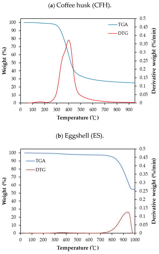 (a) Thermogravimetric analysis/derivative thermogravimetry (TGA/DTG) curves of (a) coffee husk and (b) eggshell at the heating rates of 10 °C/min.