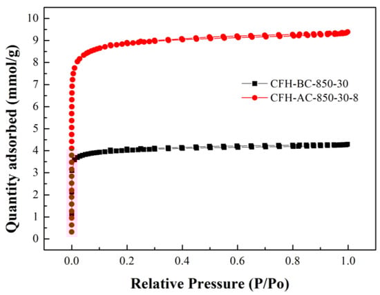 N2 adsorption–desorption isotherms of resulting carbon materials (i.e., CFH-BC-850-30 and CFH-AC-850-30-8).