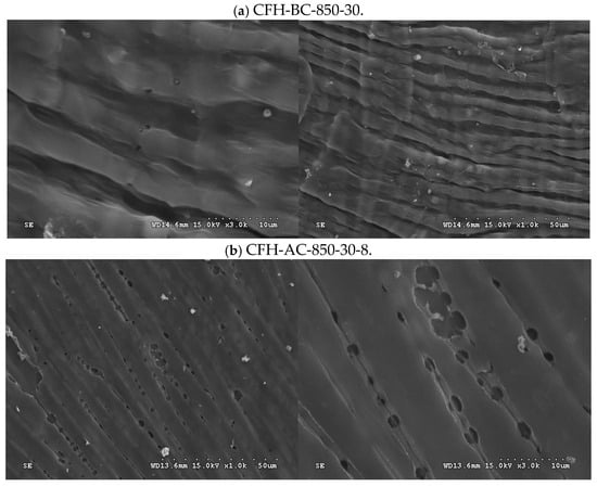 The porous structure inferred from nitrogen adsorption–desorption analysis (Table 2 and Table 3, and Figure 2) was further confirmed by scanning electron microscopy (SEM). Representative samples CFH-BC-850-30 and CFH-AC-850-30-8 were selected for surface morphology analysis. As shown in Figure 4, the AC material exhibited a significantly more porous structure compared to the biochar under the two magnifications (i.e., ×1000 and ×3000). These observations were consistent with the pore properties derived from BET analysis and the nitrogen adsorption–desorption isotherms. The SEM images also revealed a shriveled, rod-like morphology on the surface of the carbon matrix, which may be attributed to the vascular structure of the lignocellulosic biomass (i.e., coffee husk) and its transformation under high temperature carbonization (850 °C).