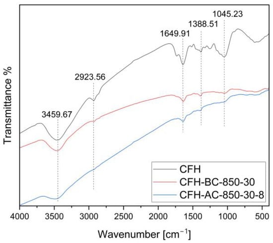 Fourier Transform infrared spectroscopy (FTIR) spectra of coffee husk (CFH) and the resulting carbon materials (i.e., CFH-BC-850-30 and CFH-AC-850-30-8).