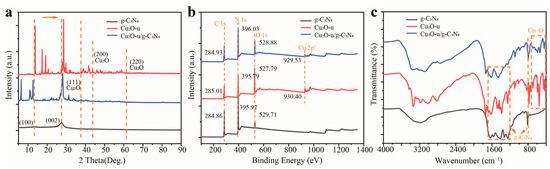 (a) XRD pattern of Cu2O-u, g-C3N4, and Cu2O-u/g-C3N4; (b) XPS survey spectra of Cu2O-u, g-C3N4, and Cu2O-u/g-C3N4 (binding energies were calibrated by C 1s peak at 284.6 eV); (c) FTIR spectra of Cu2O-u, g-C3N4, and Cu2O-u/g-C3N4.
