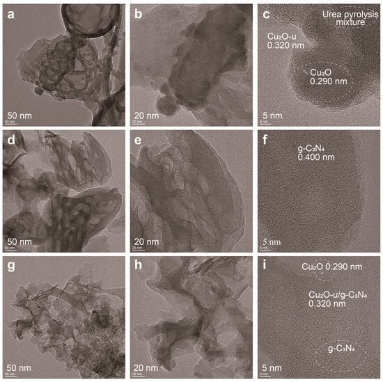 The morphology of Cu2O-u, g-C3N4, and Cu2O-u/g-C3N4 was characterized by TEM (Figure 2). The TEM images (Figure 2a–c) revealed that Cu2O-u exhibited both crystalline and amorphous regions, indicating that Cu2O was composited with rearranged urea and formed a porous structure similar to g-C3N4, resulting from the release of NH3 and CO2 during the thermal reaction. Specifically, the average lattice distance of Cu2O-u was 0.290 nm, while its amorphous pore size distribution ranged from approximately 0.2 to 0.5 nm, with a mean value of 0.320 nm. For g-C3N4 (Figure 2d–f), irregular pores with an average size of 0.400 nm were observed, attributed to NH3 and CO2 release during calcination. As shown in Figure 2g–i, Cu2O-u/g-C3N4 exhibited a surface morphology resembling that of g-C3N4. Meanwhile, the average amorphous pore size of Cu2O-u/g-C3N4 (0.320 nm) was smaller than that of g-C3N4. Furthermore, no regular lattices associated with metal oxides were detected in g-C3N4 or Cu2O-u/g-C3N4, confirming their amorphous nature. Notably, the crystalline phase of Cu2O-u (8 wt%) was obscured by the predominant amorphous g-C3N4 matrix.