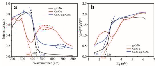 (a) UV–vis DRS spectrum of the Cu2O-u, g-C3N4, and Cu2O-u/g-C3N4; (b) Tauc Plots corresponding with (a).