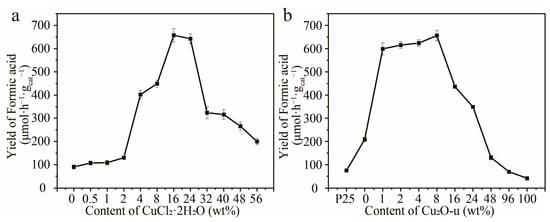First, the influence of CuCl2·2H2O dosage (0, 0.5, 1, 2, 4, 8, 16, 24, 32, 40, 48, and 56% (w/w)) was evaluated (Figure 4a). Under identical experimental conditions, Cu2O-u/g-C3N4 demonstrated optimal catalytic performance for CPR-mediated formic acid synthesis when the CuCl2·2H2O dosage ranged between 16–24% (w/w). The highest catalytic activity was achieved at a CuCl2·2H2O-to-urea mass ratio of 16:84, yielding a formic acid synthesis efficiency of 657.40 μmol·h−1·gcat−1.