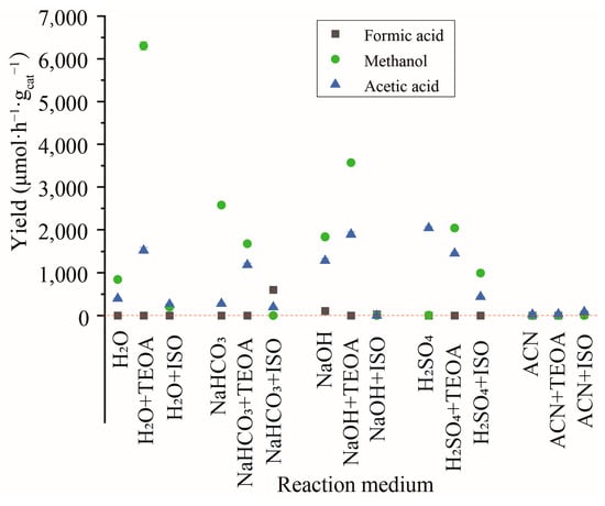 To investigate the influence of the reaction system on the product selectivity of Cu2O-u/g-C3N4 catalyzed CPR, liquid-phase CPR was conducted under various reaction systems composed of different reaction media (water, 0.5 mol·L−1 NaHCO3, 0.5 mol·L−1 NaOH, 0.5 mol·L−1 H2SO4, and acetonitrile) and hole scavengers (isopropanol and TEOA). The reactions were performed under irradiation from a 175 W mercury lamp for 2 h, using 0.01 wt% Cu2O-u/g-C3N4 and 4 wt% hole scavenger.