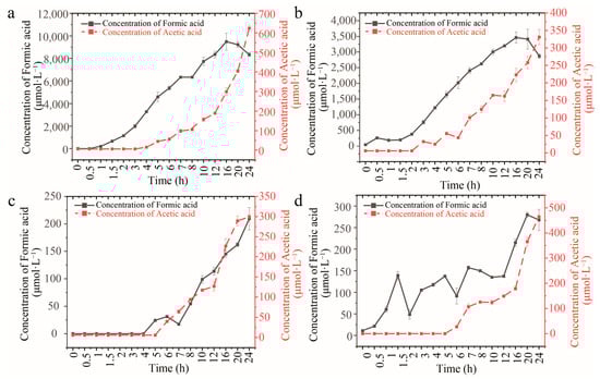 Based on the above analysis, when isopropanol acts as the hole scavenger, the Cu2O-u/g-C3N4 heterojunction catalyst exhibits enhanced accumulation of formic acid and acetic acid during CPR. Consequently, we investigated the potential of Cu2O-u/g-C3N4 for synthesizing formic and acetic acids via CPR in an isopropanol system was investigated.