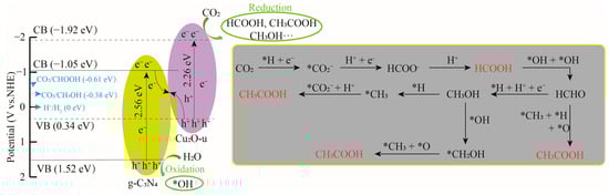 Figure 7 illustrates the proposed mechanism for the Cu2O-u/g-C3N4-catalyzed CPR reaction []. Dissolved CO2 exists as HCO3− in the aqueous reaction medium and is subsequently adsorbed onto the surface of the Cu2O-u/g-C3N4 []. Upon photoactivation, the heterojunction generates photogenerated electron–hole pairs. The adsorbed HCO3− then reacts with photogenerated electrons migrating to the surface, undergoing reduction to form *CO2−, with protons *H supplied by the reaction environment [,]. The *CO2− radical is further reduced to HCOO−, yielding formic acid (HCOOH). Subsequently, HCOOH is reduced by radicals (*OH) to formaldehyde (HCHO) as an intermediate []. HCHO is then reduced to methanol (CH3OH) []. CH3OH is further reduced to intermediate transition states such as *CH2OH and *CH3 [,]. Finally, these intermediate species (*CH2OH, *CH3) either react with each other or with *CO2−. Facilitated by photogenerated electrons, radicals, and protons, these species form C-C bonds, enabling the extension from C1 to C2 products, and thus synthesizing C2 compounds such as acetic acid []. CPR selectivity for specific CO2 reduction pathways can be enhanced or suppressed depending on the reaction medium and hole scavengers []. For instance, an alkaline solvent increases CO2 solubility, thereby enhancing HCOOH synthesis []. Meanwhile, TEOA not only enhances HCOOH formation but also rapidly consumes photogenerated holes, generating oxidized intermediates that promote the synthesis of the intermediate product CH3OH [].