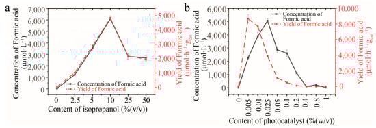 Figure 8a illustrates the effects of isopropanol and Cu2O-u/g-C3N4 concentration on CPR activity. The catalytic activity of Cu2O-u/g-C3N4 for formic acid synthesis increased steadily with increasing isopropanol concentrations, reaching a maximum formic acid conversion rate of 4832.20 μmol·h−1·gcat−1 at 10% (v/v) isopropanol. However, when isopropanol concentration exceeded 10%, excessive isopropanol competitively occupied the active sites on the Cu2O-u/g-C3N4 heterojunction surface, resulting in a decrease in CPR activity [].