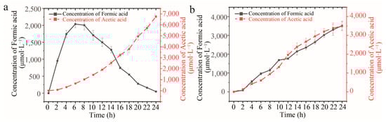 Although Cu2O-u/g-C3N4 efficiently catalyzes the production of formic acid and acetic acid via CPR in the NaHCO3/isopropanol system, an acetonitrile/isopropanol system appears to facilitate subsequent direct organic transformations of CPR-derived C1 or C2 products using other catalysts, such as lipase-catalyzed ester synthesis reactions using formic acid or acetic acid []. Therefore, NaHCO3 was replaced with acetonitrile (which has approximately eight times higher CO2 solubility than aqueous environments []) to establish an acetonitrile/isopropanol system. The activity of Cu2O-u/g-C3N4 in catalyzing the synthesis of formic acid and acetic acid via CPR in this system was investigated. Experimental results (Figure 9b) revealed that the initial yields of both formic acid and acetic acid were low. However, both acids accumulated rapidly after 4 h of reaction. After 24 h, the concentrations of both formic acid and acetic acid approached 3500 μmol·L−1, with conversion rates of 579.4 and 582.8 μmol·h−1·gcat−1, respectively. These results demonstrate that Cu2O-u/g-C3N4 is capable of efficiently catalyzing the simultaneous production of formic acid and acetic acid via CPR in acetonitrile, with comparable synthesis rates for both acids.