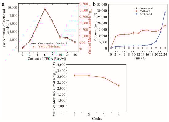 Figure 10a illustrates the effect of TEOA concentration on methanol synthesis efficiency in the CPR process. As the TEOA concentration increased, the methanol synthesis efficiency increased initially and then decreased, a trend which is consistent with observations in the isopropanol system. This indicates that excessive TEOA (as a hole scavenger) adversely affects CPR activity. At a TEOA concentration of 6% (v/v), the maximum methanol synthesis efficiency was 3061.6 μmol·h−1·gcat−1, accompanied by a corresponding methanol accumulation of 9797.2 μmol·L−1. As shown in Table 1, the methanol synthesis efficiency catalyzed by the Cu2O-u/g-C3N4 ranks among the highest reported in the literature for other catalysts.