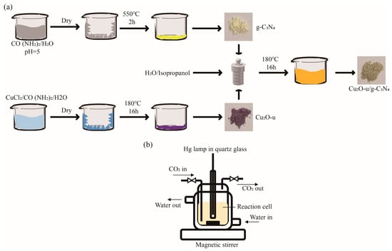 Illustration of fabrication of Cu2O-u, g-C3N4, and Cu2O-u/g-C3N4 (a), photoreduction system of CO2 (b).