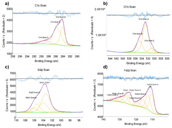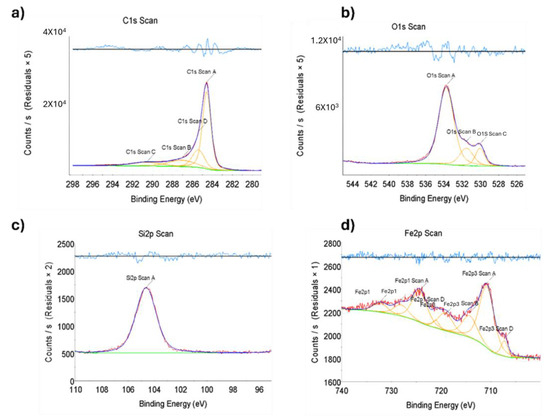 X-ray photoelectron spectroscopy (XPS) of nanomaterial, the binding energy of Fe/Zeolite@CCNC (1). Scans for (a) C 1s, (b) O 1s, (c) Si 2p, and (d) Fe 2p. Red: data scan; Dark Blue: data fit; Orange and Green: deconvolution analysis; Light Blue: residual plot.