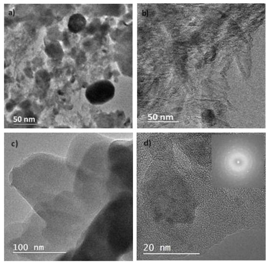 Transmission electron microscopy (TEM) of (a) Fe/Zeolite@CCNC (1), (b) Fe/Zeolite/CNT@CCNC (3), (c) control sample (nanocellulose + zeolite), and (d) HRTEM of Fe/Zeolite@CCNC (1) along with its diffraction pattern.