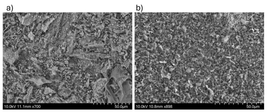 Scanning electron microscopy (SEM) of (a) Fe/Zeolite@CCNC (1) and (b) Fe/Zeolite@CCNF (2).