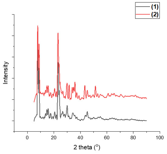 Powder X-ray diffraction of Fe/Zeolite@CCNC (1) and Fe/Zeolite@CCNF (2).