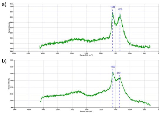 The degree of graphitization and defect level of the as-prepared nanomaterial are investigated using Raman spectroscopic characterization of the nanocatalyst; the resulting findings are shown in Figure 7a,b. The nanocatalyst’s Raman spectra revealed two distinctive peaks at around 1588 cm−1 and 1338 cm−1 for the Fe/Zeolite@CCNC (1) and 1590 cm−1 and 1371 cm−1 for Fe/Zeolite@CCNF (2), which correspond to the G (graphite) and D (defects and disorder) bands, respectively.