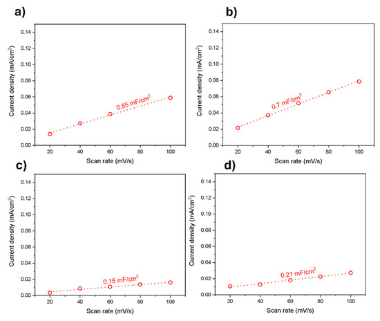 Electrochemical double-layer capacitance studies of (a) Fe/Zeolite@CCNC (1), (b) Fe/Zeolite/CNT@CCNC (3), (c)Fe/Zeolite@CCNF (2), and (d) Fe/Zeolite/CNT@CCNF (4).