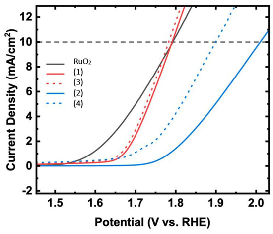 OER polarization of commercial powder RuO2, Fe/Zeolite@CCNC (1), Fe/Zeolite@CCNF (2), Fe/Zeolite/CNT@CCNC (3), and Fe/Zeolite/CNT@CCNF (4) catalysts in 0.1M KOH at 1600 rpm.