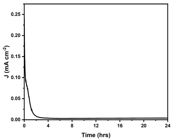 The stability of the Fe/Zeolite/CNT@CCNC (3) was assessed through a Chronoamperometry experiment over 24 h using a glassy carbon working electrode, a platinum counter electrode, and a 3 M Ag/AgCl reference electrode. A 0.1M KOH solution served as the electrolyte for the experiment. A 20 μL of the sample was drop-casted onto the working electrode surface and allowed to dry at room temperature. The potential was maintained at 1.75 V vs. RHE. The constant potential was used throughout the test. The current density was measured over time and expressed as a percentage of its initial value. A decrease in current density occurred within the first 2 h, indicating a decline in performance under the applied OER potential and the alkaline conditions. After this initial drop, the current stabilized with some residual, non-zero activity, as shown in Figure 10. These findings suggest that the catalyst’s core structure has a practical operational lifetime of two hours under the applied OER potential and alkaline conditions.