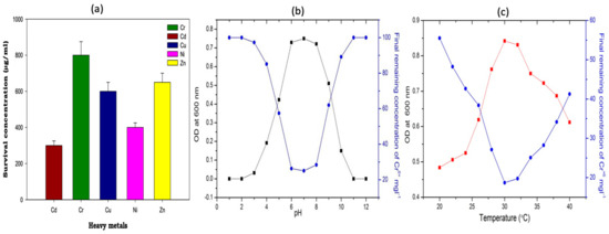 ) heavy metals and Cr(VI) at variable pH; (c) the cellular growth (