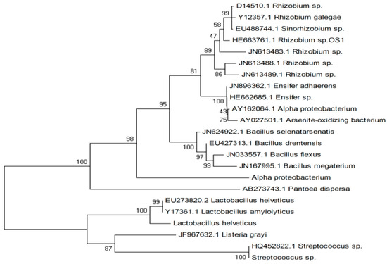 A widely accepted method for species-level identification of the bacterial strain OS-1 was carried out using 16SrRNA gene sequencing [22]. The sequencing and analysis, performed by Macrogen, Inc., revealed that strain OS-1 belongs to the genus Rhizobium and is specifically identified as Rhizobium sp. with GenBank accession number HE663761. This identification was further supported by biochemical, morphological, and cultural characteristics consistent with Berge’s Manual of Determinative Bacteriology [14]. The highest similarity of the bacterial sequence was determined using a BLASTn analysis of the 16S rRNA nucleotide sequences [23]. This research confirmed the isolate’s significant similarity to other bacterial genomes and its close relationship to nitrogen-fixing Rhizobium species. The 16SrRNA sequences were obtained by EMBL and NCBI, allowing for global access to genetic information [24]. Phylogenetic analysis was performed using the MEGA 7 tool [25]. When compared to reference strains from NCBI GenBank, the phylogenetic tree constructed from 16S rRNA sequences firmly placed Rhizobium sp. OS-1 (HE6637) in Group I of Rhizobium species. With a bootstrap value of 100, the phylogenetic tree highlighted the strain’s genetic distinctiveness within its genus, as well as its analytical strength (Figure 2). These results suggest that Rhizobium sp. OS-1 is a symbiotic nitrogen-fixing bacterium with significant potential for agricultural applications, particularly in promoting leguminous crop productivity under various environmental conditions [26]. The molecular characterization and phylogenetic placement of this strain contribute to understanding its evolutionary relationships and functional roles in plant–microbe interactions [27].