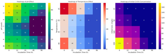 The heat map illustrates the patterns of chromium reduction, highlighting threshold effects. The graphs demonstrate how pH, temperature, and the initial Cr(VI) concentration influence the levels of residual Cr(VI) over time.