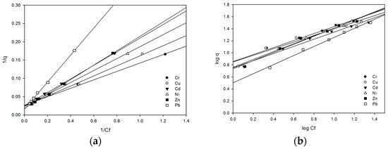 A best-fit curve of (a) Langmuir and (b) Freundlich adsorption isotherms of metal ions on the biosorbent biomass of Rhizobium sp. OS-1.