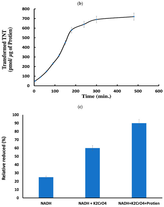 The second panel shows TNT (2,4,6-trinitrotoluene) biotransformation over 500 min. The transformation rate rises dramatically within the first 200 min; it progressively levels toward a plateau at 700 pmol/μg protein. Main findings: Rapid TNT transformation in the first phase (0–200 min) suggests strong enzyme activity or substrate availability (Figure 5b). After 400 min, the plateau can indicate either substrate depletion, buildup of inhibitory chemicals, or enzyme activity saturation. The findings show that the bacterial extract may efficiently change TNT, stressing its possible use in environmental bioremediation of explosive substances, and this property supports hexavalent chromium reduction.