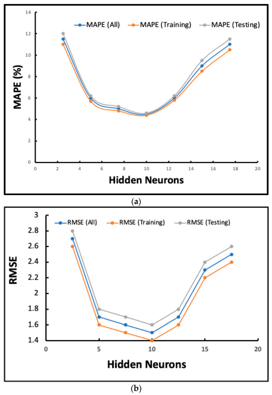 Initial improvement: The MAPE and RMSE values decrease significantly for both training and testing data as the number of hidden neurons increases from 2 to approximately 10. This indicates that the model’s accuracy and ability to generalize have significantly improved within this range.