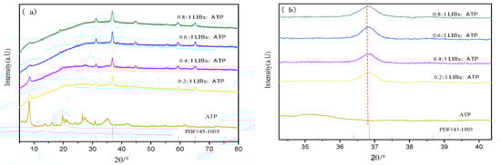 XRD measurements were performed to determine the crystal structures of ATP and the Ni:Co3O4/ATP composites. As shown in Figure 1a, the characteristic diffraction peaks observed for all Ni:Co3O4/ATP samples, prepared with varying mass ratios of LIBs to ATP, can be indexed to Co3O4 (JCPDS PDF#43-1003) and attapulgite (JCPDS PDF#21-0958). Specifically, the diffraction peaks of the Ni:Co3O4 component located at 31.2°, 36.7°, and 44.6° are assigned to the (220), (311), and (400) crystal planes of the spinel structure, respectively. The peak at 8.49° corresponds to the (110) plane of ATP. The intensity of the (220), (311), and (400) diffraction peaks, attributed to the Ni:Co3O4 phase within the Ni:Co3O4/ATP composites, decreases with an increase in Ni:Co3O4 loading (i.e., increasing LIBs:ATP mass ratio). Figure 1b presents a magnified view of the XRD patterns focusing on the (311) diffraction peak. Analysis reveals that as Ni:Co3O4 loading increases, the (311) peak position shifts towards lower angles ascribed to the structural stain in the samples [10], accompanied by a broadening of its full width at half maximum. This observation suggests a reduction in the crystallinity of the Ni:Co3O4 spinel and potentially an increase in the concentration of oxygen vacancies [11].