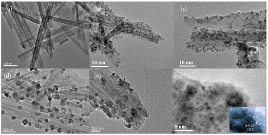TEM images revealing the structural features of ATP and the Ni:Co3O4/ATP composites are presented in Figure 2. Figure 2a shows that ATP exhibits its characteristic rod-like morphology. The Ni:Co3O4/ATP composites prepared with LIBs:ATP mass ratios of 0.8:1 and 0.6:1 (Figure 2b and Figure 2c, respectively) display significant nanoparticle aggregation. In contrast, the 0.4:1 Ni:Co3O4/ATP sample (Figure 2d) demonstrates well-dispersed Ni:Co3O4 nanoparticles without noticeable aggregation or detachment. The relative content of Ni:Co3O4 is comparatively lower in the 0.2:1 Ni:Co3O4/ATP sample (Figure 2e). Figure 2f provides a HRTEM image of the 0.4:1 Ni:Co3O4/ATP nanocomposite. The image reveals ordered lattice fringes with an interplanar spacing of 0.24 nm, corresponding to the (311) plane of Co3O4. This observation is consistent with the XRD results.