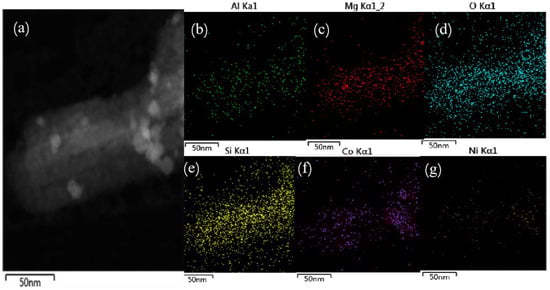 STEM imaging and elemental mapping of the Ni:Co3O4/ATP composite: (a) HAADF-STEM image; EDS elemental mapping for (b) Al, (c) Mg, (d) O, (e) Si, (f) Co, and (g) Ni.