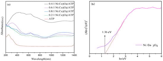 Figure 4a displays the UV–Vis diffuse reflectance spectra of ATP and the Ni:Co3O4/ATP composites with varying Ni:Co3O4 loading amounts. Compared to ATP, the light absorption capability of the Ni:Co3O4/ATP composites initially strengthened and then weakened with an increase in Ni:Co3O4 loading. The 0.4:1 Ni:Co3O4/ATP sample exhibited the strongest light absorption probably due to the best dispersion status according to the TEM results. The composites showed enhanced absorption peaks within the range of 600–800 nm thanks to the highly exposed area. This phenomenon is attributed to the generation of oxygen vacancies induced by loading Ni:Co3O4 onto the ATP support, which subsequently triggered a localized LSPR effect [12]. The Tauc plots for ATP and Ni:Co3O4 are presented in Figure 4b (judging the bandgap energy from the red dashed tangent line). The optical band gap energies Eg of the semiconductors were calculated using the Kubelka–Munk equation [13], as follows: