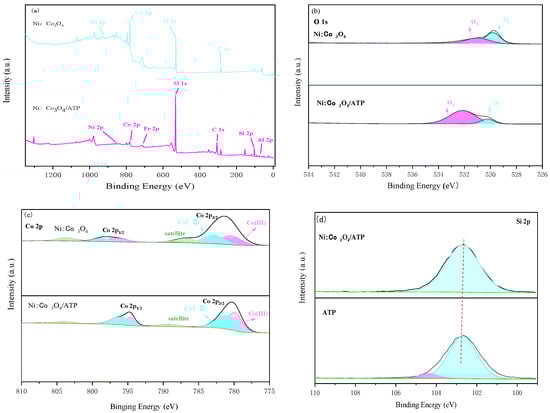 XPS spectra of Ni:Co3O4 and the 0.4:1 Ni:Co3O4/ATP composite synthesized from spent LIBs: (a) survey spectra; high-resolution spectra of (b) O 1s, (c) Co 2p, and (d) Si 2p.