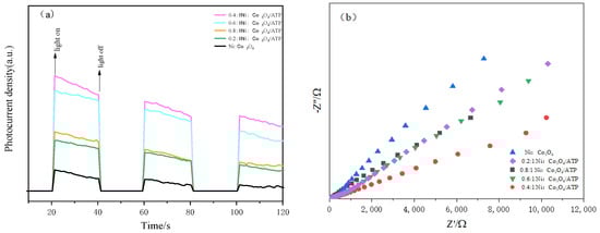 Electrochemical characterization was performed to investigate the charge carrier separation efficiency of Ni:Co3O4 and Ni:Co3O4/ATP composites with varying loading ratios (0.2:1 to 0.8:1). Figure 7a presents the transient photocurrent responses of Ni:Co3O4 and the Ni:Co3O4/ATP composites with different loading ratios. The Ni:Co3O4/ATP composites exhibit significantly stronger photocurrent responses compared to pure Ni:Co3O4. This enhancement indicates that the formation of the composite structure between Ni:Co3O4 and ATP facilitates more efficient charge carrier separation. Furthermore, the composite with the 0.4:1 loading ratio demonstrated the highest photocurrent intensity, signifying its superior charge separation efficiency among the tested samples [17]. Additionally, electrochemical impedance spectroscopy (EIS) measurements were conducted on Ni:Co3O4 and the Ni:Co3O4/ATP composites (0.2:1 to 0.8:1) to assess charge transfer kinetics. A smaller arc radius in the Nyquist plot corresponds to lower electrochemical impedance [18]. Figure 7b reveals that the Ni:Co3O4/ATP composite with the 0.4:1 loading ratio exhibits the smallest arc radius, while pure Ni:Co3O4 displays the largest impedance. This observation indicates that compositing Ni:Co3O4 with ATP significantly enhances charge carrier mobility.