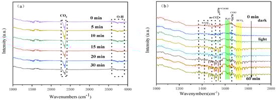 In situ DRIFTS spectra monitoring the reaction of CO2 and H2O over Ni:Co3O4/ATP: (a) adsorption process and (b) reaction process under illumination.