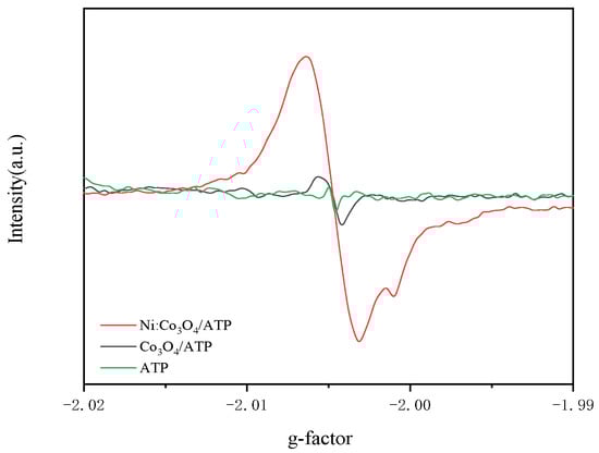 Electron paramagnetic resonance (EPR) spectroscopy was employed to analyze oxygen vacancies in ATP, Co3O4/ATP, and the 0.4:1 Ni:Co3O4/ATP composite. As shown in Figure 9, no distinct EPR signal was detected for pristine ATP. In contrast, both Co3O4/ATP and 0.4:1 Ni:Co3O4/ATP exhibited characteristic EPR signals at g = 2.007. Notably, the 0.4:1 Ni:Co3O4/ATP sample synthesized from spent LIBs demonstrated a significantly stronger EPR signal intensity compared to the Co3O4/ATP sample prepared from analytical-grade reagents. This enhanced signal intensity indicates a higher concentration of unpaired electrons in the Ni:Co3O4/ATP composite, attributable to an increased density of oxygen vacancies. When oxygen atoms are absent from the lattice, neighboring metal atoms can retain unpaired electrons, thereby forming paramagnetic centers. This result is consistent with the findings from XPS and XRD analyses [22].